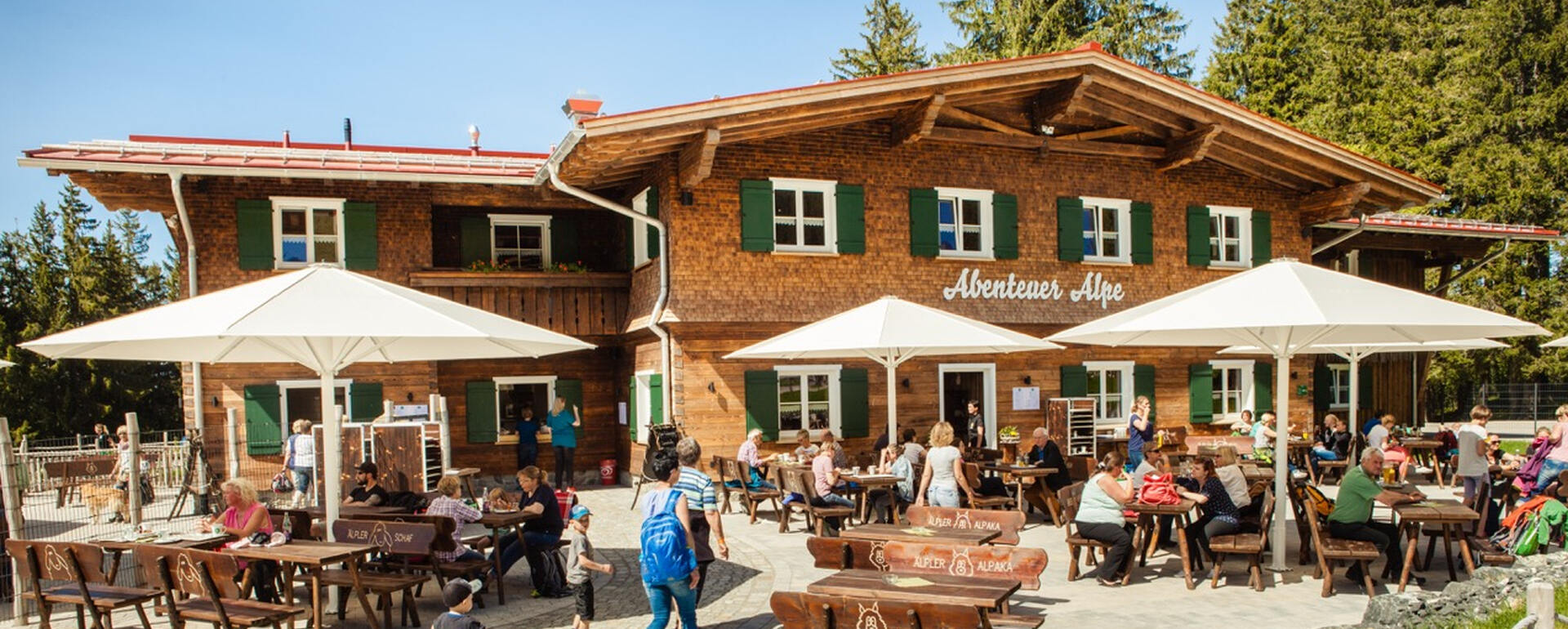Spiel, Spaß & Genuss mit Allgäu-Flair. Direkt neben dem Kletterwald Bärenfalle und dem Alpsee Coaster liegt in der Alpsee Bergwelt unsere Abenteuer Alpe. Ideal für Geburtstage, kleine Firmenausflüge oder Vereinsausflüge. Während die Kleinen draußen toben, genießt ihr Kässpatzen & Co auf der Sonnenterrasse – oder feiert ausgelassen euer Fest bis in die Nacht hinein.